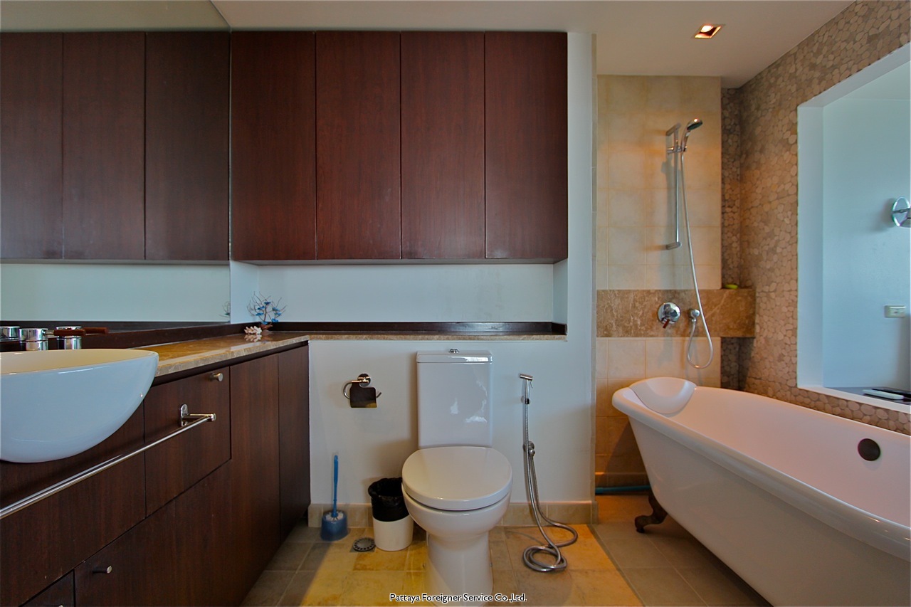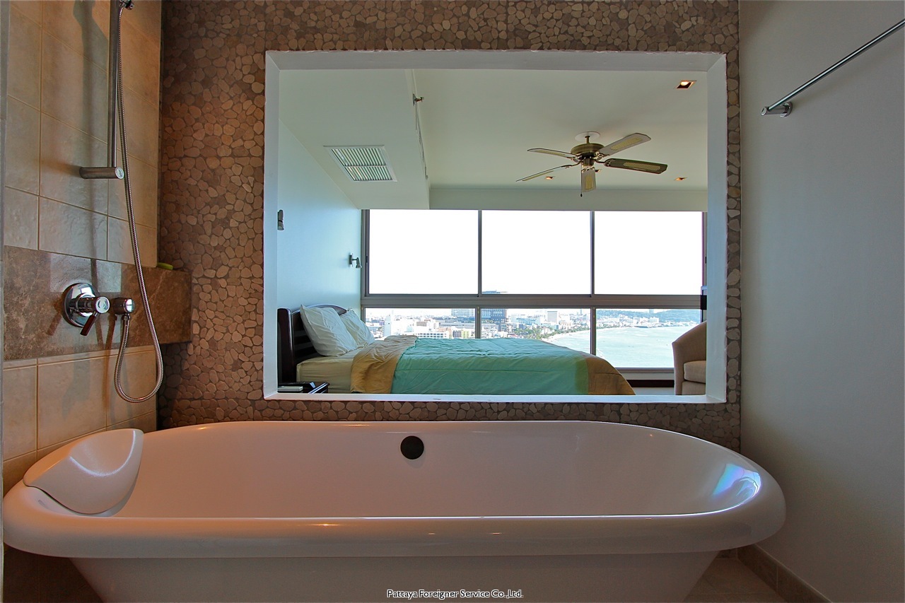 There is a sliding door between the master bedroom and the livingroom, a luxurious office table in the living room and one bathroom even has a bathtub from where you can enjoy views over Pattaya Bay.